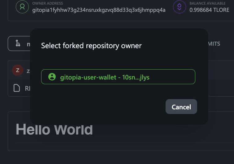 Next, you will be prompted to select the owner of the forked repository. You can choose your wallet address or select the address of a DAO you are a member of in order to add the forked repository to the DAO.