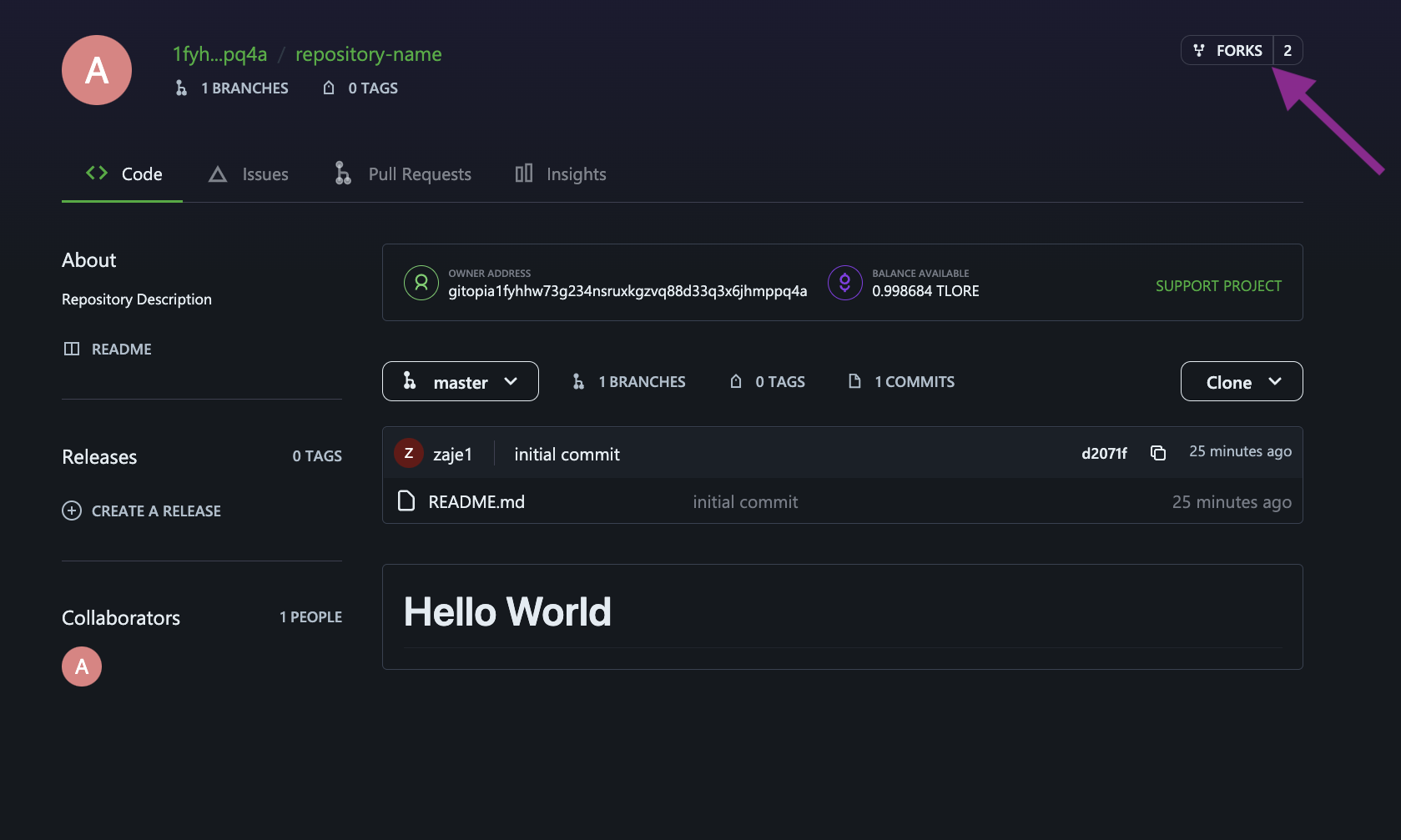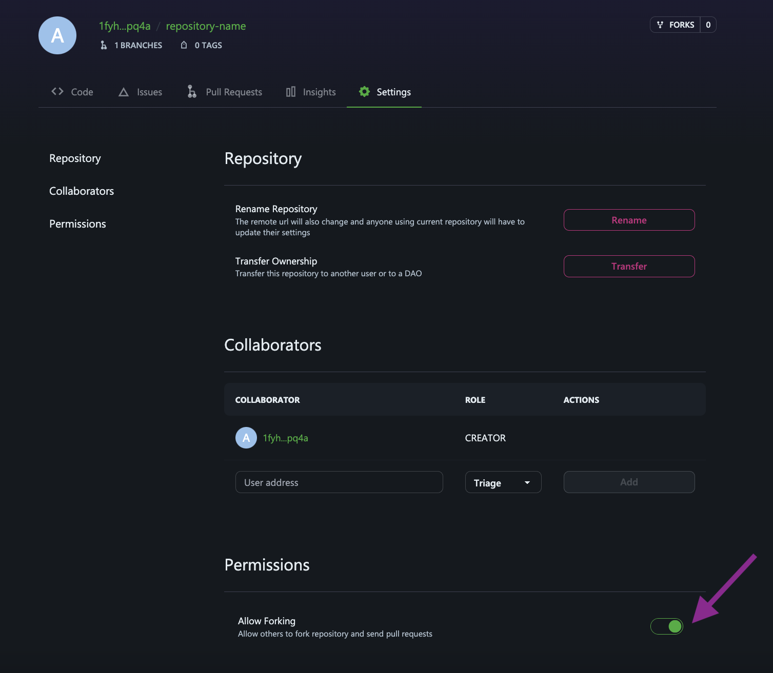 Forking a repository on Gitopia is disabled by default. Navigate to your repository’s settings page and click on Allow Forking to enable forks.