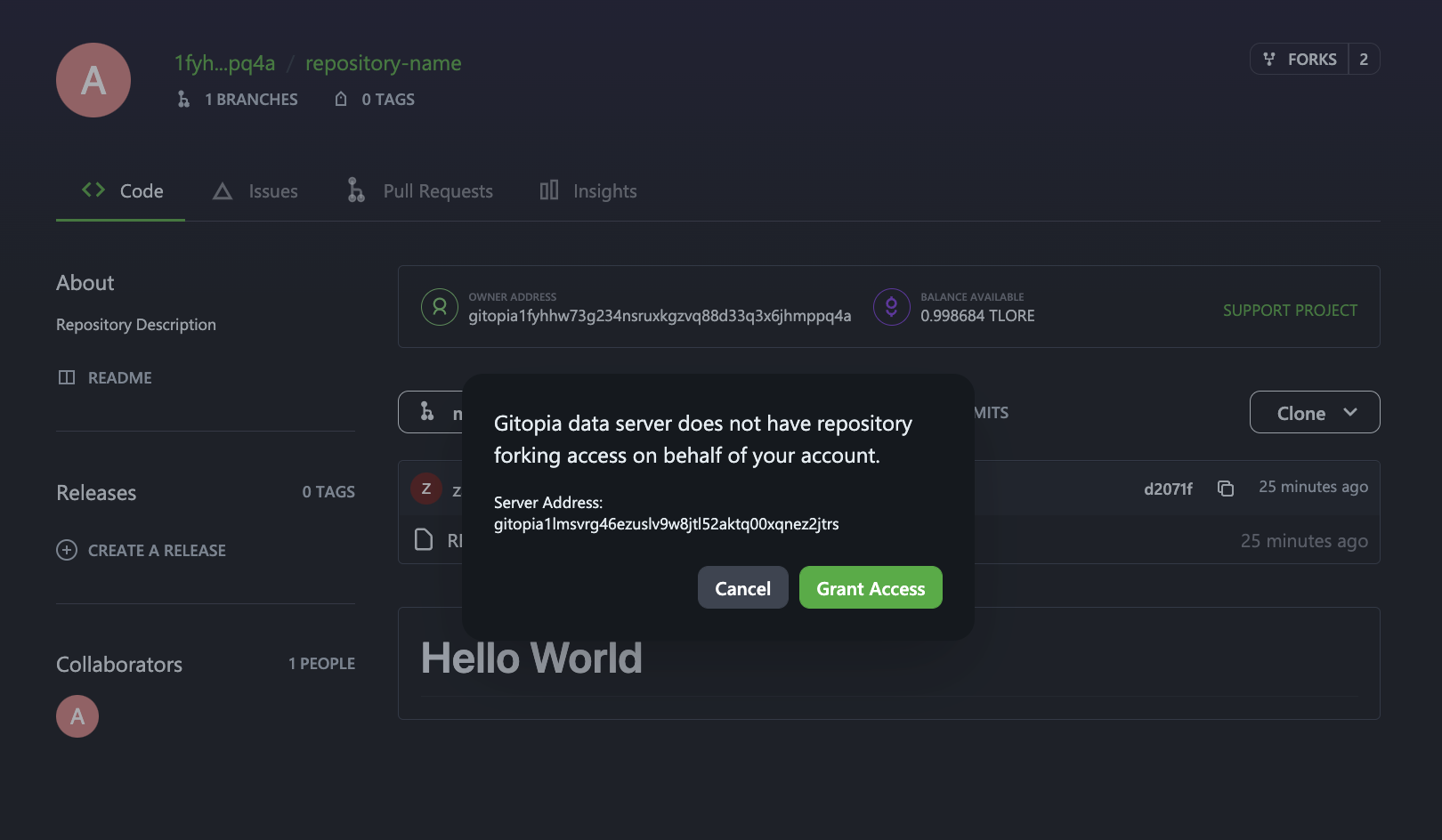 You will first be prompted to give forking access to the Gitopia data server. Click on Grant Access.