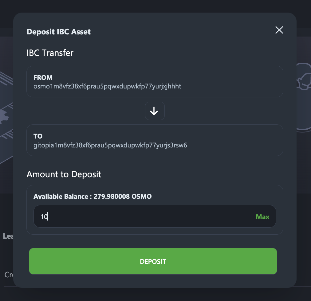 - A Deposit IBC Asset Dialog box will pop up. Here you can see your gitopia address under TO and the equivalent osmosis address under FROM. You will need to add tokens to the equivalent address before proceeding.