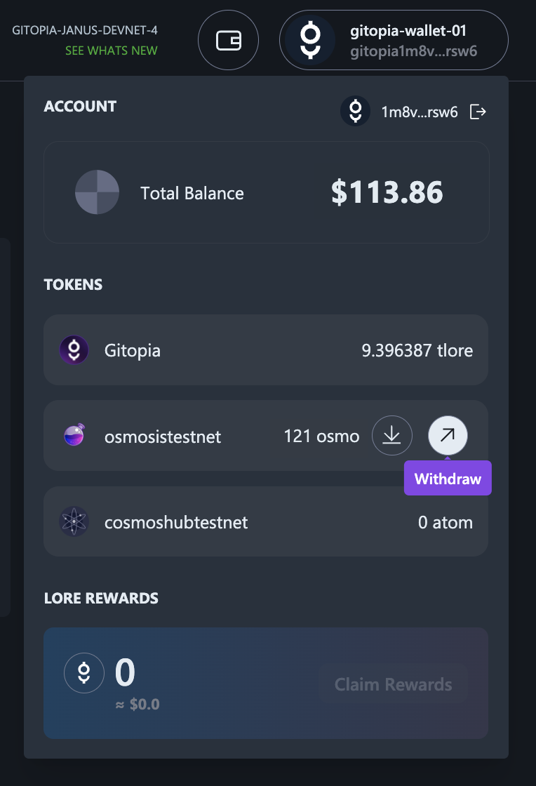 - Next, enter the amount of tokens you want to withdraw from the gitopia wallet and click on Withdraw.